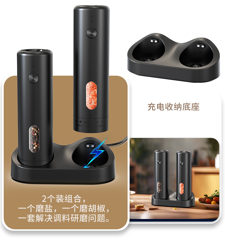 陶瓷胡椒研磨器 ODM/OEM代工厂| 胡椒研磨器批发商 KYMQ-65C款贴牌定制|电商爆款厨房小家电批发拿货|科力通-27年源头厂家 2025新款2只装底座充电电动重力感应胡椒盐研磨器带外部粗细调节环