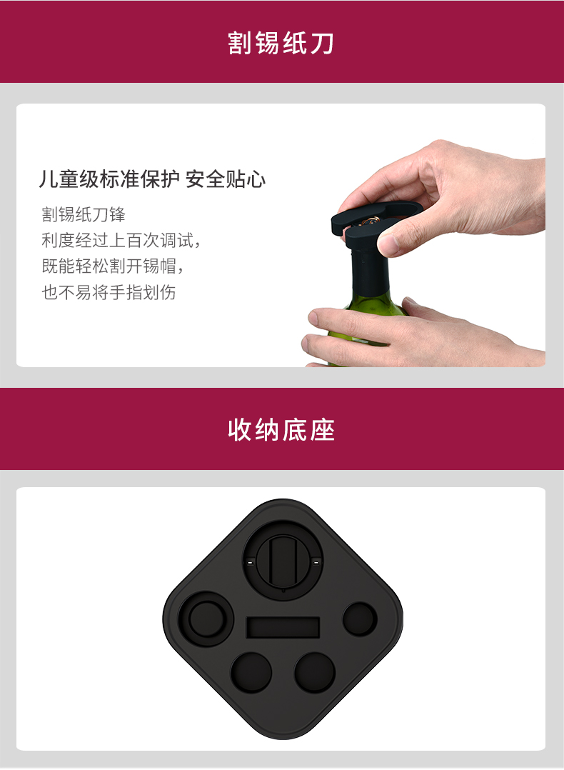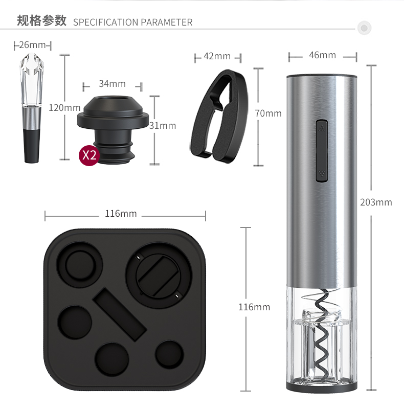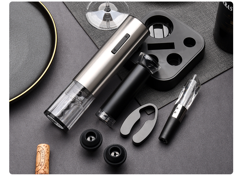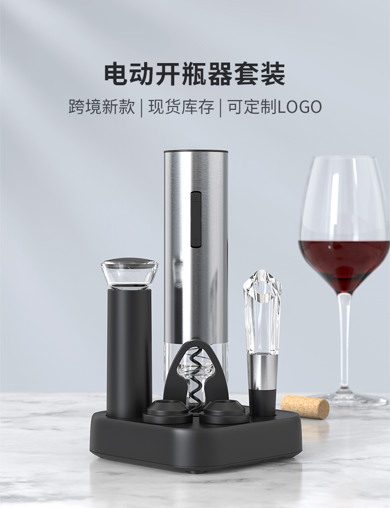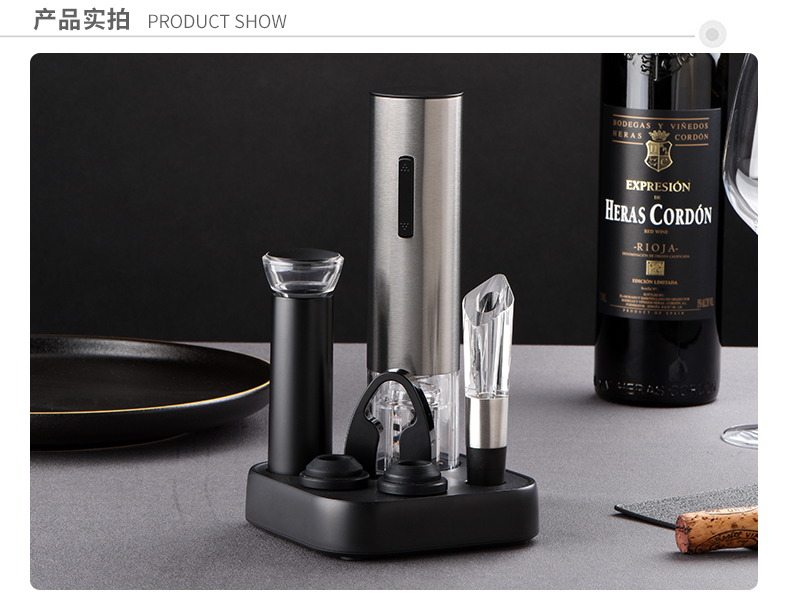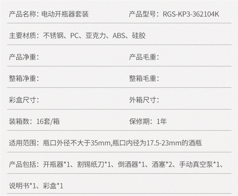 3. 组合:KP3-362104K底座充电款电动开瓶器、割锡纸刀、WP-009倒醒酒器、KVS-22一泵二塞、KP1124充电底座、充电线、说明书、彩盒