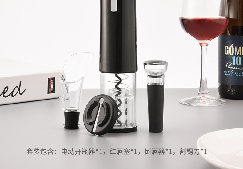 3. 组合: KB1-601801D干电池款电动开瓶器、割锡纸刀、倒酒器、抽拉式真空塞、说明书、彩盒