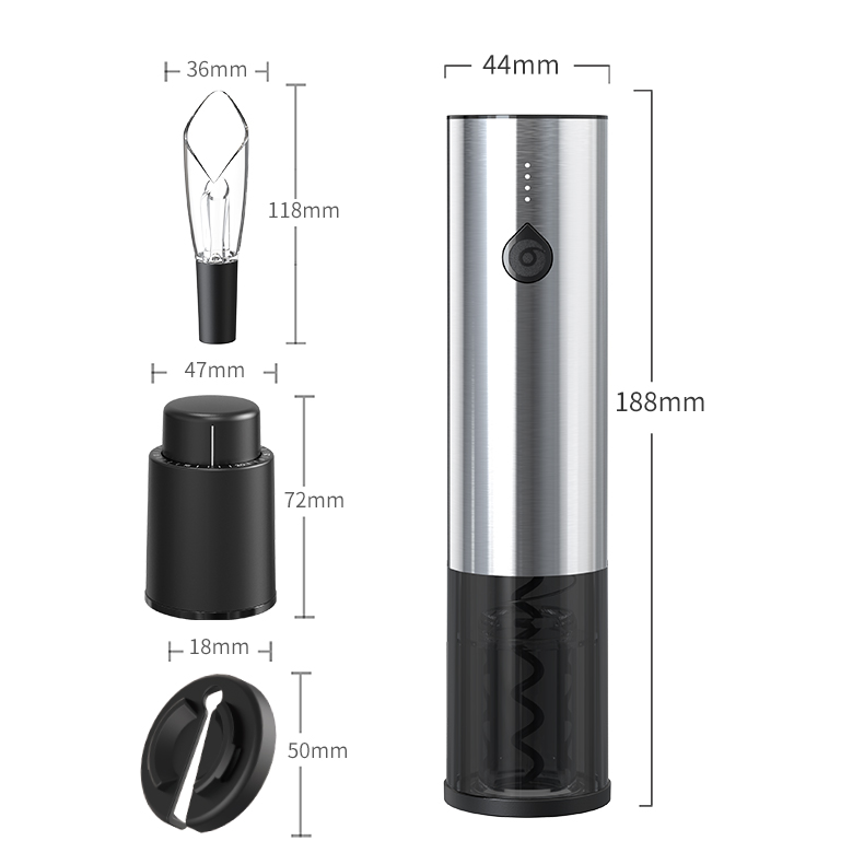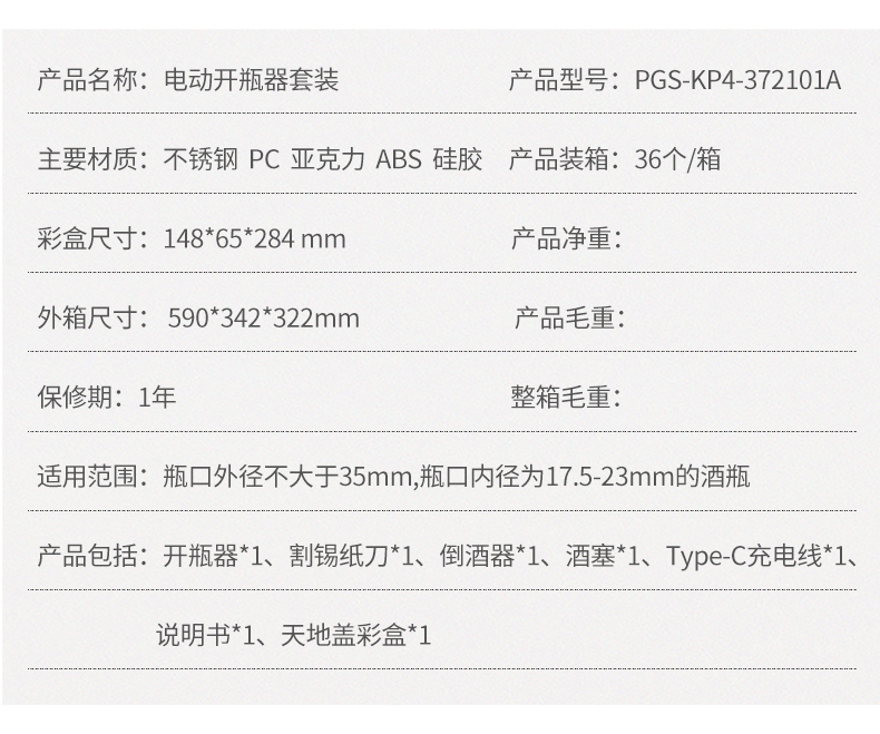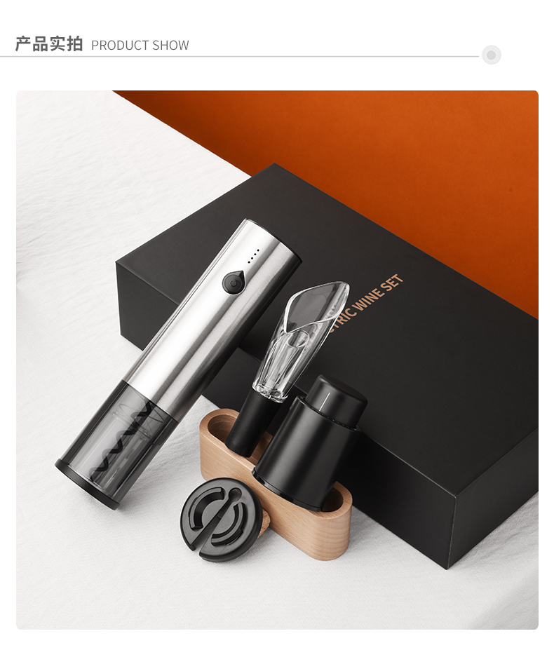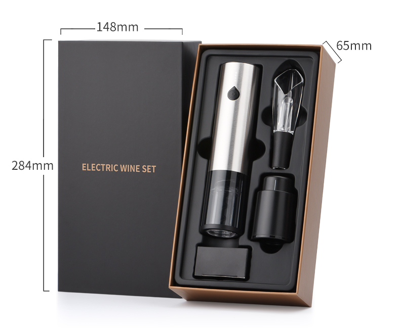 3. 组合:KP4-372101A锂电全自动式电动开瓶器、割锡纸刀、WP-011郁金香倒醒酒器、SP-002真空塞、说明书、天地盖礼盒