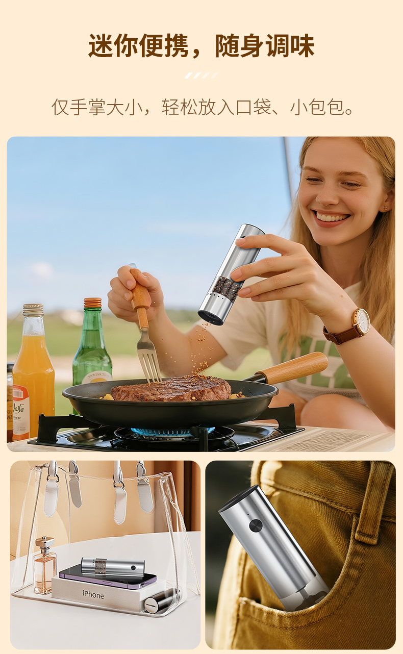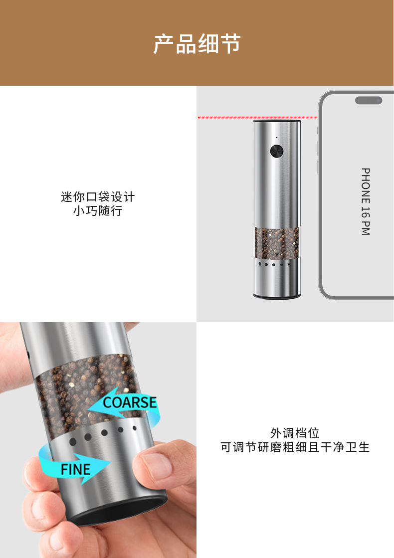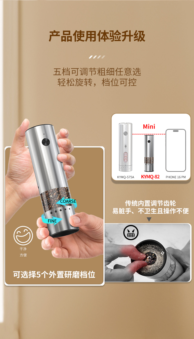 日韩友好款 2025 科力通最新迷你款电动胡椒研磨器(单支装) ODM/OEM代工厂 | 胡椒研磨器推荐 KYMQ-82A款 贴牌定制|电商爆款厨房小家电批发拿货|科力通-27年源头厂家 2025新款充电不锈钢电动胡椒盐研磨器 外部粗细调节环